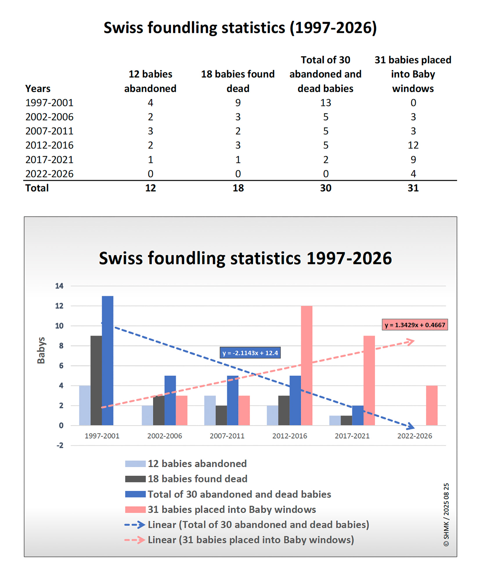 The investigation includes all known cases of babies found dead (killed), abandoned or delivered. Time intervals of five years each were compared. Since the first baby window was put into operation in 2001, the number of babies found dead has fallen significantly. Baby window operators attribute this positive development at least in part to the existence of baby windows.