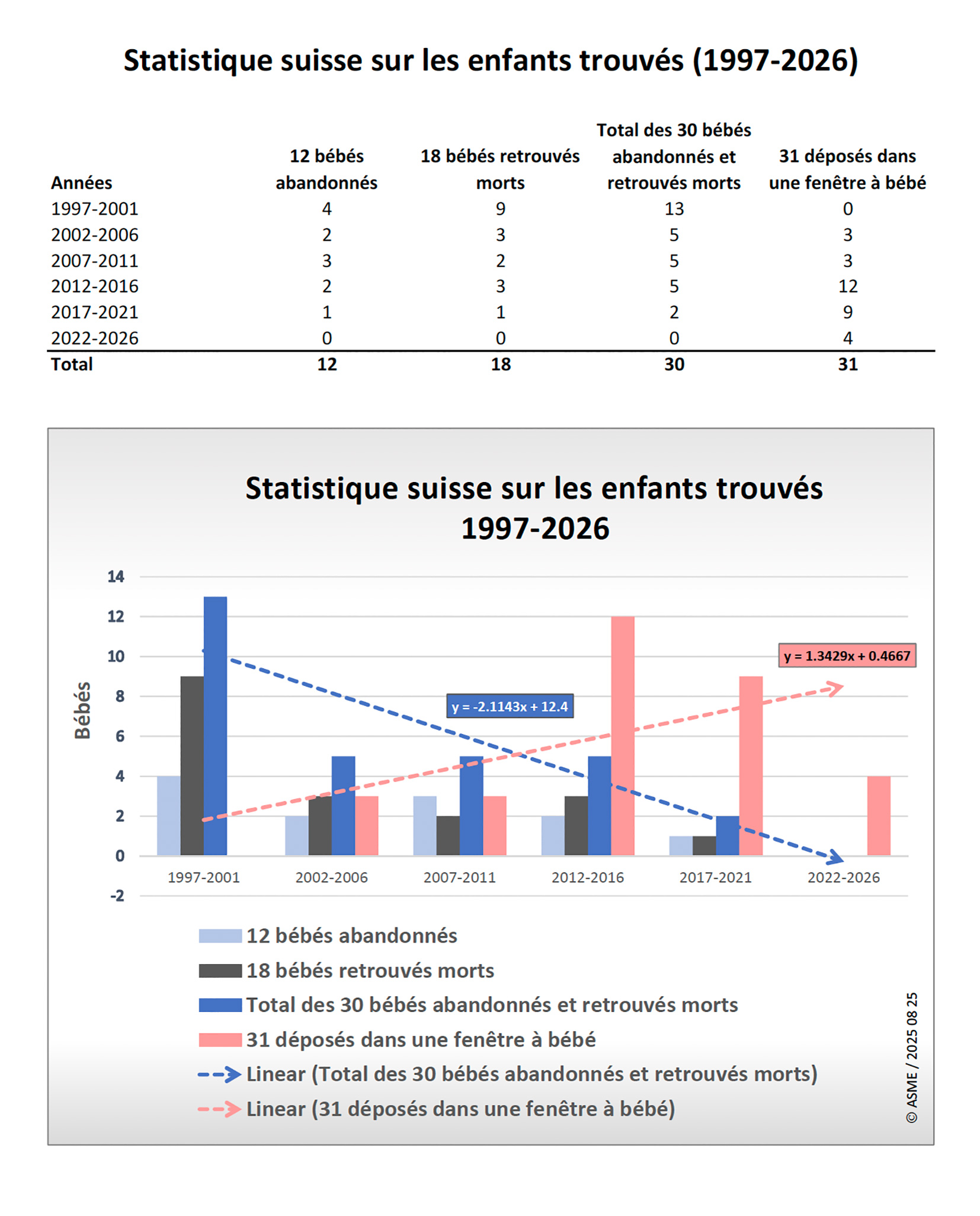 On a étudié tous les cas connus de bébés retrouvés morts, abandonnés ou placés dans des fenêtres à bébé. Pour ce faire, on a comparé des intervalles de cinq ans chacun. Depuis la mise en service de la première fenêtre à bébé dans l’année 2001, le nombre de bébés retrouvés morts a nettement diminué. Les responsables des fenêtres à bébé attribuent cette évolution positive au moins partiellement aux fenêtres à bébé.